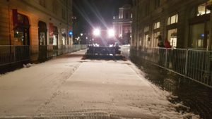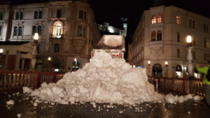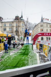 Čeprav nam je nočno deževje skoraj odplaknilo progo, za katero smo iz Planice pripeljali 300 m3 snega, se je jutro začelo po načrtih Športne zime, s snegom. Tako je bila snežna kulisa snežnega stadiona v Ljubljani taka, kot mora biti, snežena, mrzla in radostna!